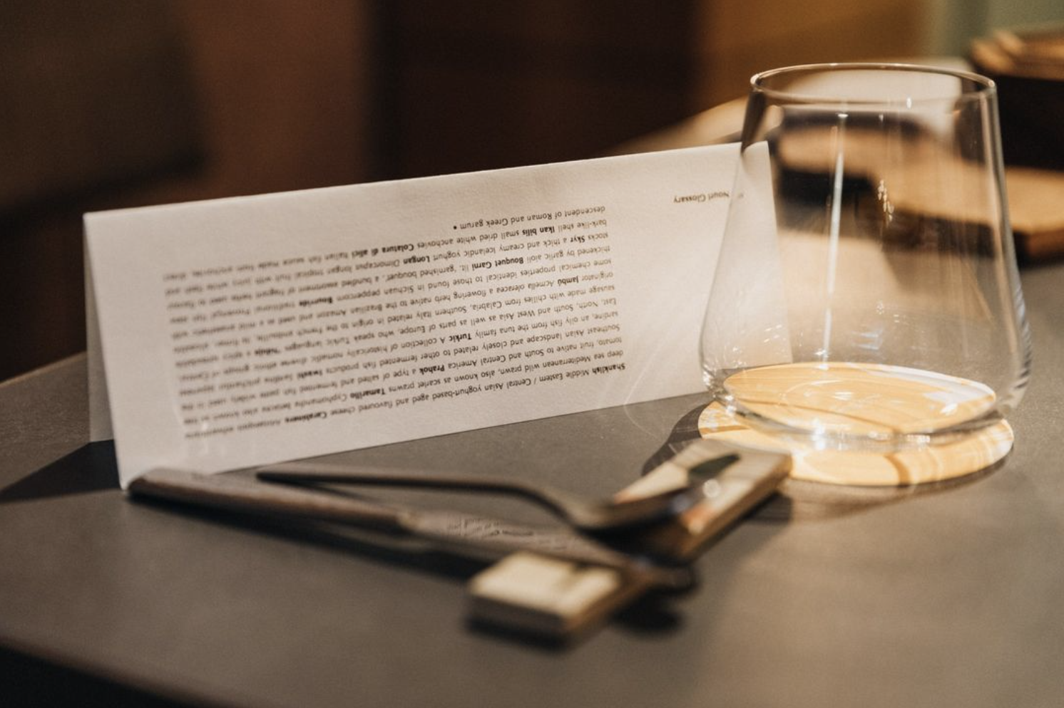 With this new menu guests are presented with Brehm’s personal poem, the 10 course menu inside - conveniently folded for easy handling at the intermission line and with a full glossary of any items on the menu that the diner can “look up”. The fold also allows diners to be able to flip the menu with one hand to said glosser. Lastly the menu is sealed with a letterpress of the Nouri signature logo.